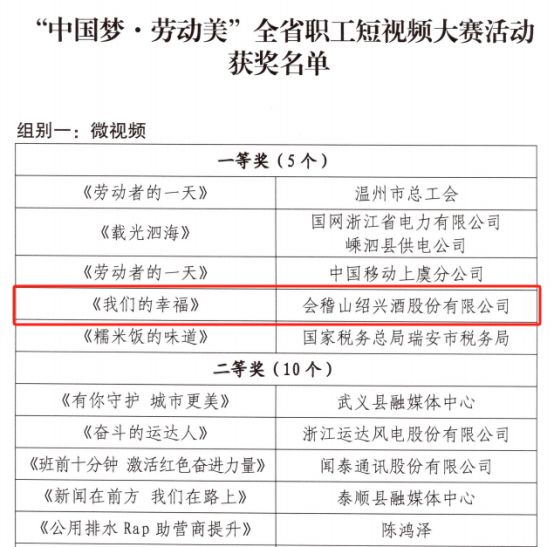 近日,浙江省总工会公布了“中国梦·劳动美”全省职工短视频大赛活动获奖名单,由W66利来绍兴酒股份有限公司制作的作品《我们的幸福》荣获短视频(微视频组)一等奖!